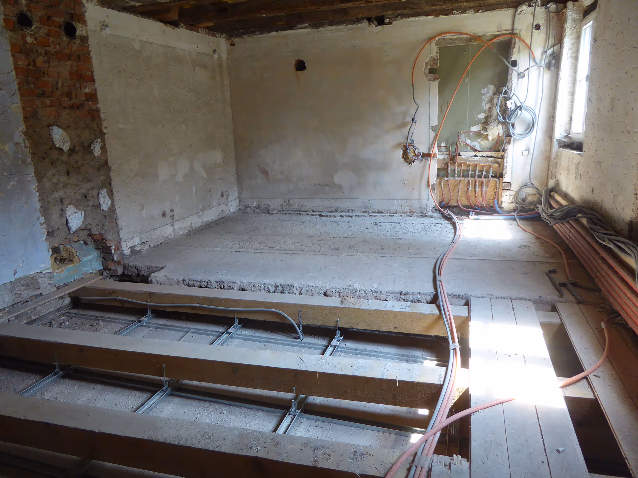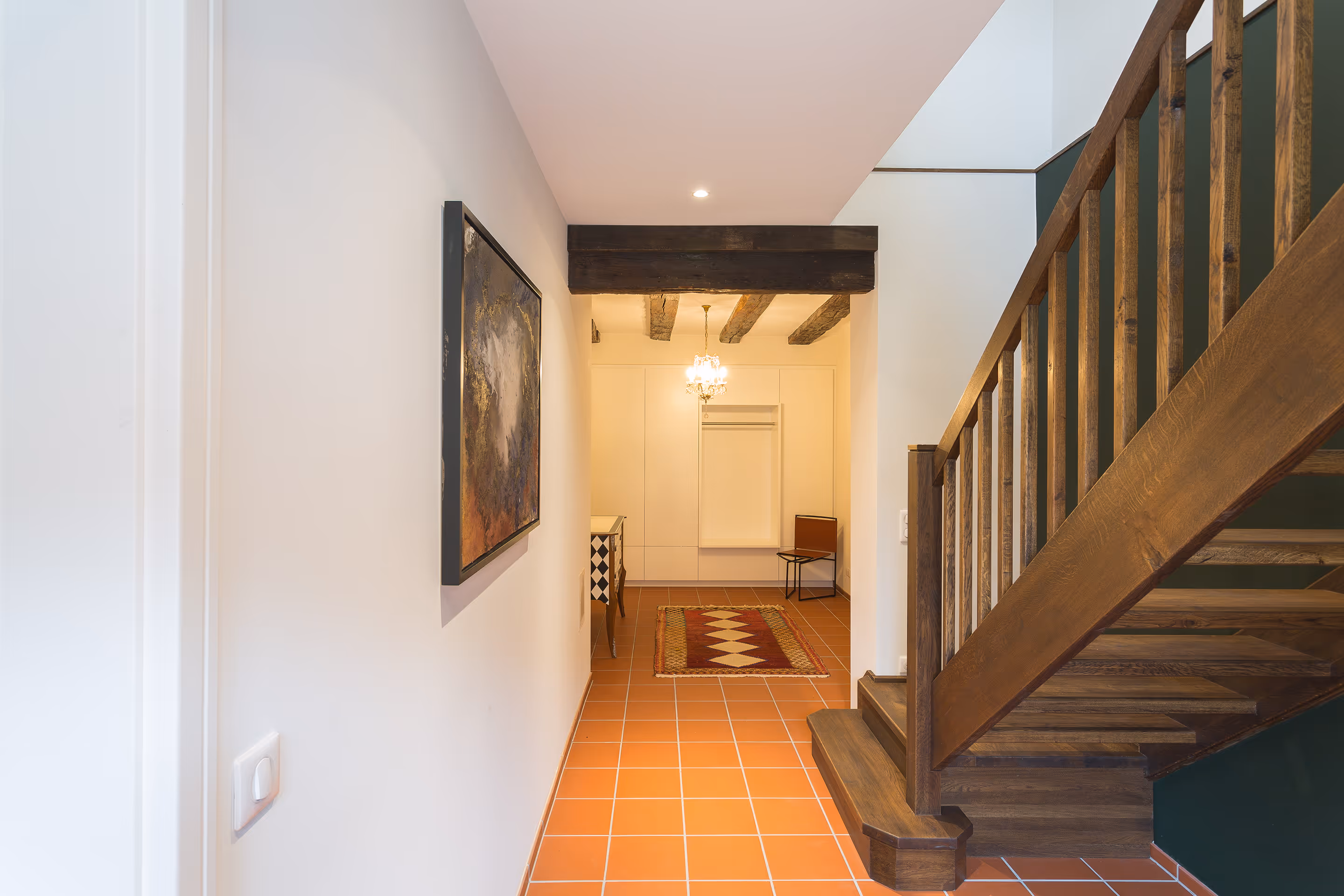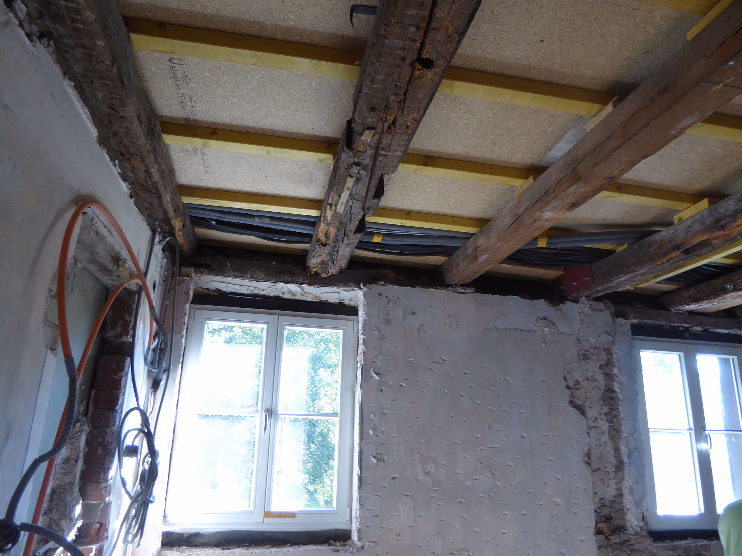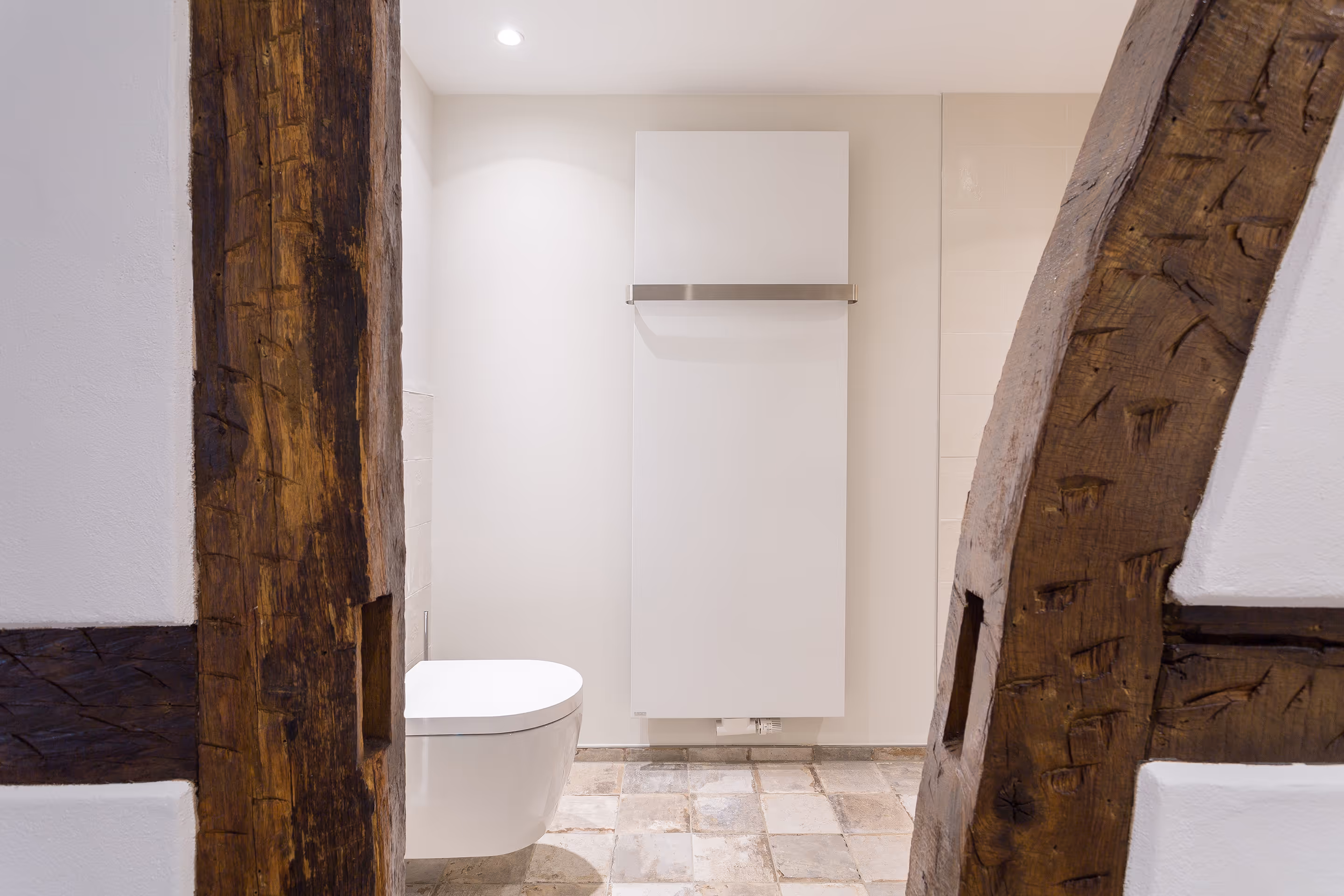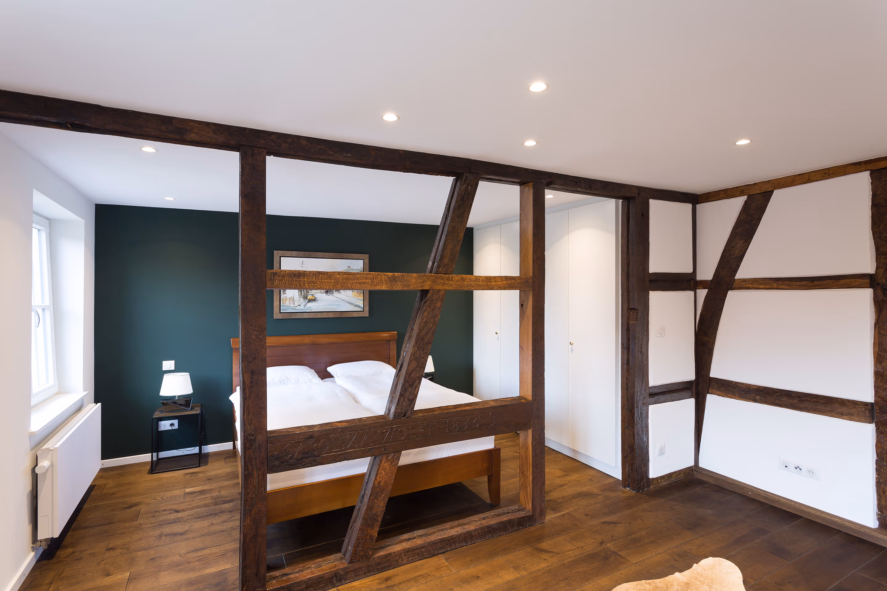Nach dem Freilegen der Substanz wurden schöne Details wie Fachwerk und Lehmputz herausgearbeitet. Innovative Technik im Bereich Heizung, Sanitär und Lüftung (HSL) wurde integriert, um den modernen Komfort zu gewährleisten.
